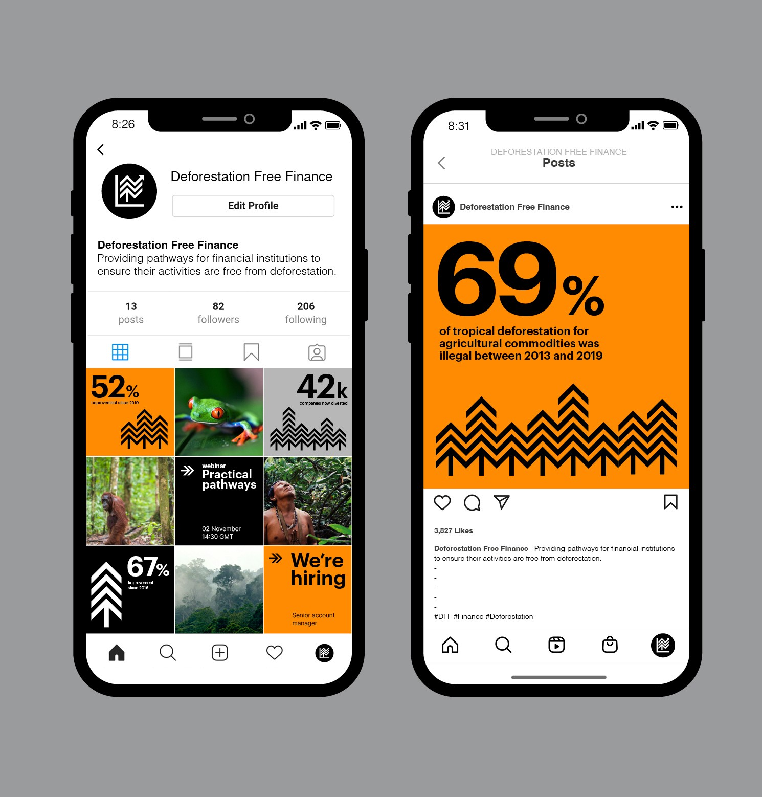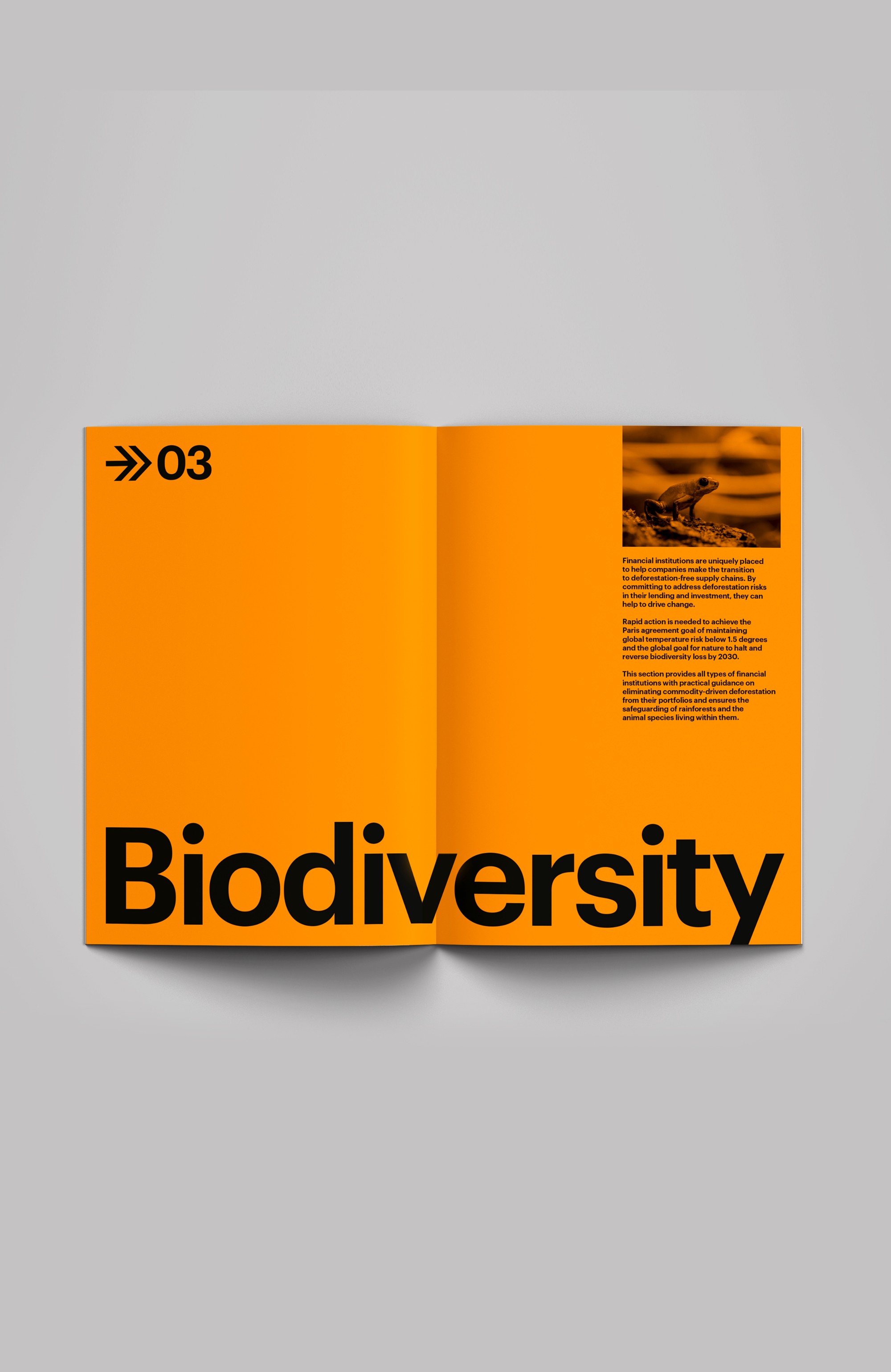 Deforestation-Free Finance brings together practical guidance developed by a broad range of partners to support financial institutions to eliminate deforestation, conversion, and associated human rights abuses from their financial portfolios. The design solution for their brand identity features an abstract tree shape that also references financial growth chart. Bold and robust, this symbol forms the starting point of a graphic language that can be used in a variety of ways for form abstract compositions that convey forests in simple to complex tileable patterns.
