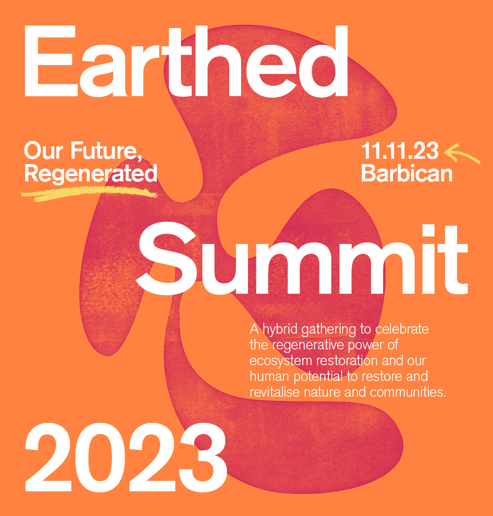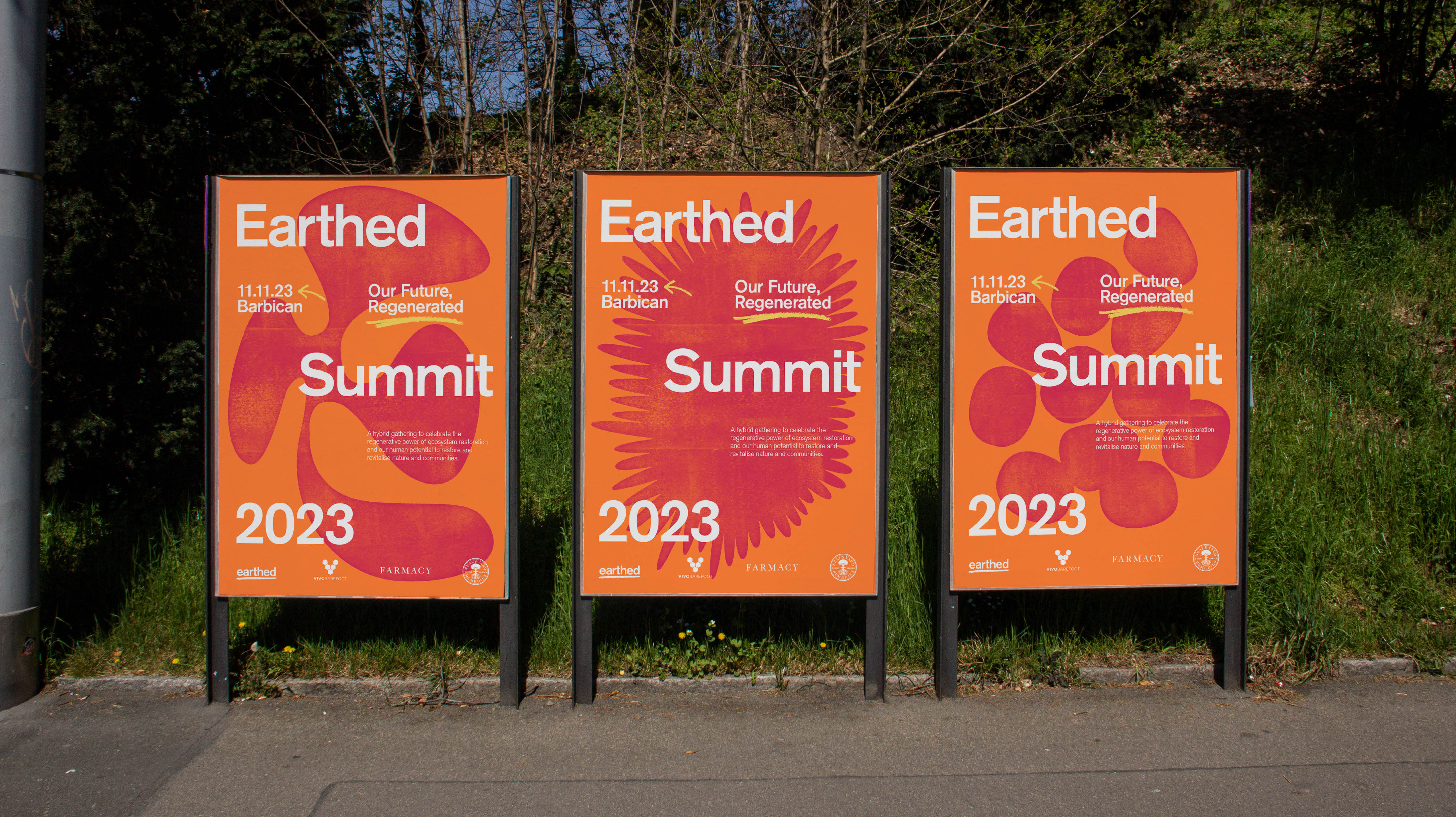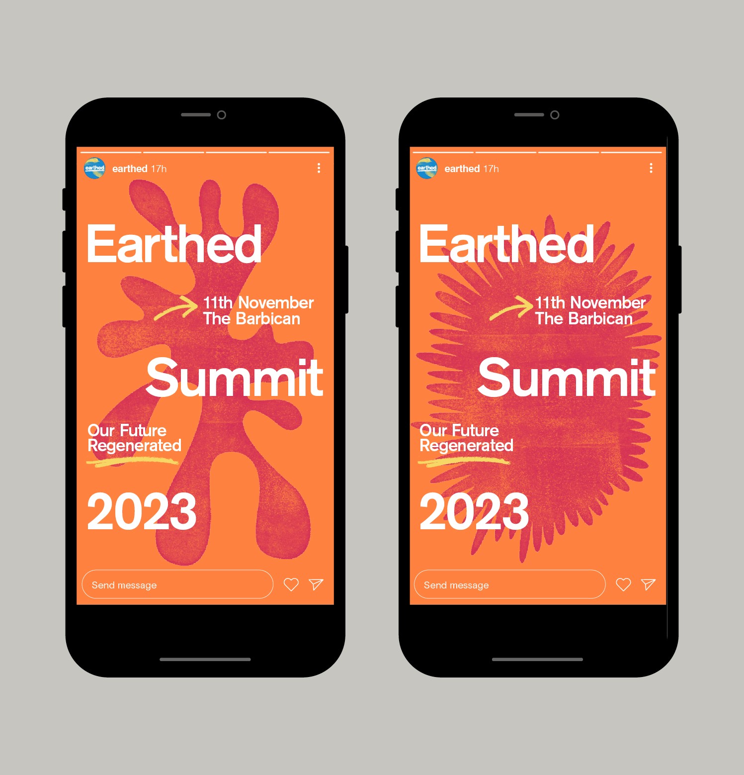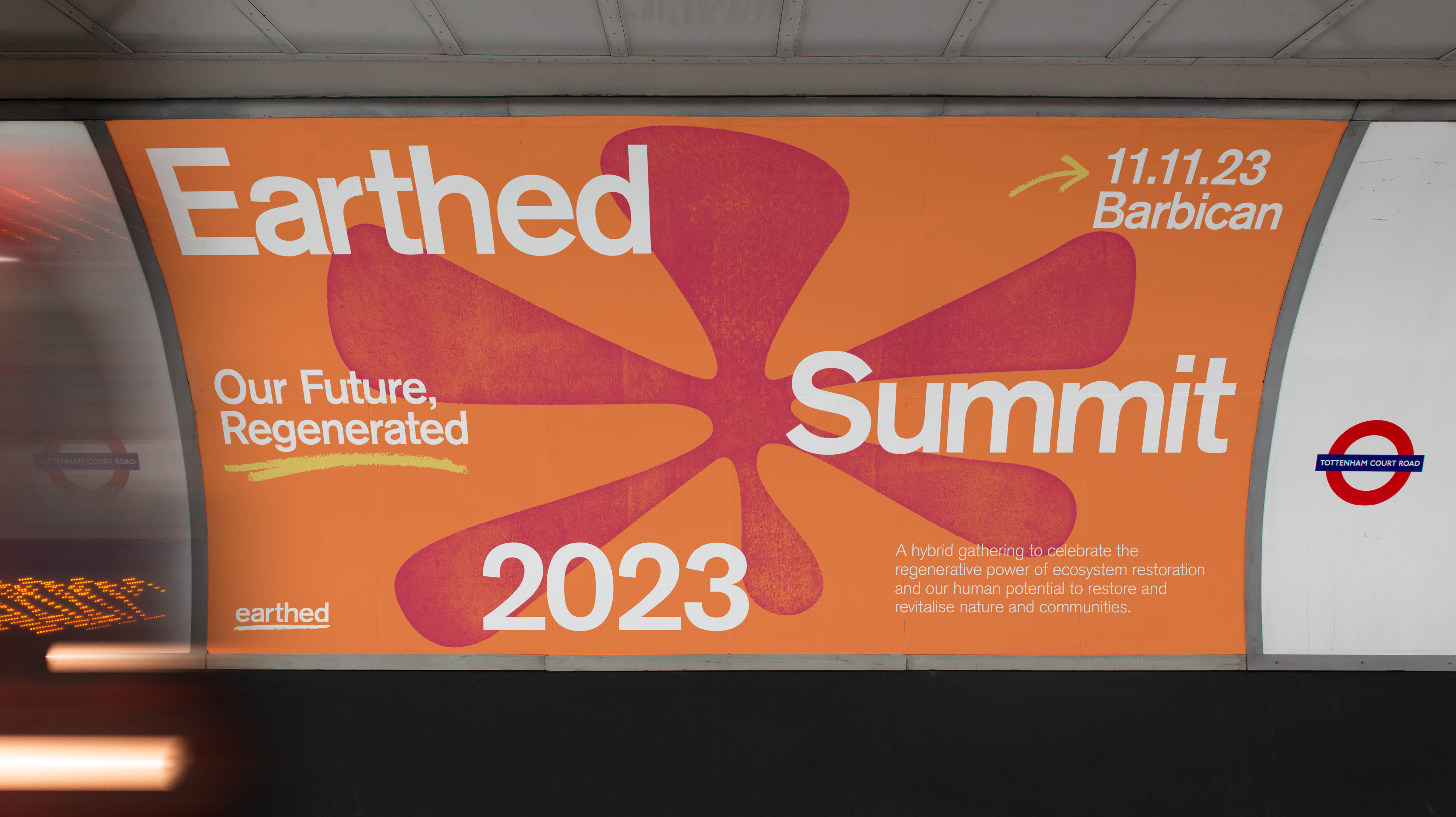 The Earthed Summit 2023 is a day of talks and discussions from over 30 ecosystem restoration teachers that celebrate the human potential to restore nature. The day focused on how how we can all actively participate in regenerating our local areas – whether that’s a windowsill, balcony, garden, disused community space, farm, river, coastline or forest. The campaign identity builds on what was originally created for the Earthed visual identity but gives it, its own distinct look using a set of biomorphic shapes that are deliberately abstract whilst still giving a sense of being organic and lifelike. The shapes have been drawn to be evocative of lifeforms that appear on land and underwater without being too literal of a particular plant or animal. The orange and red from the existing Earthed identity were paired to create a distinct sub-brand.