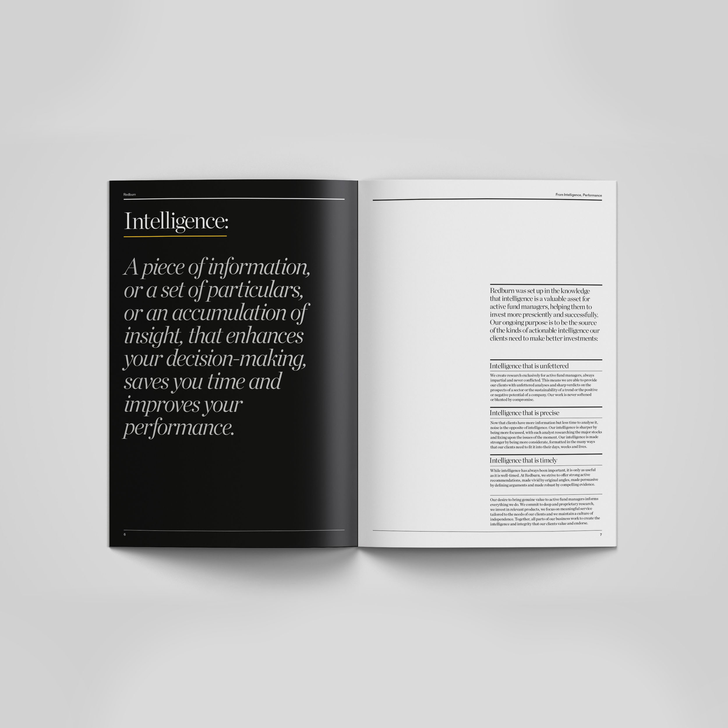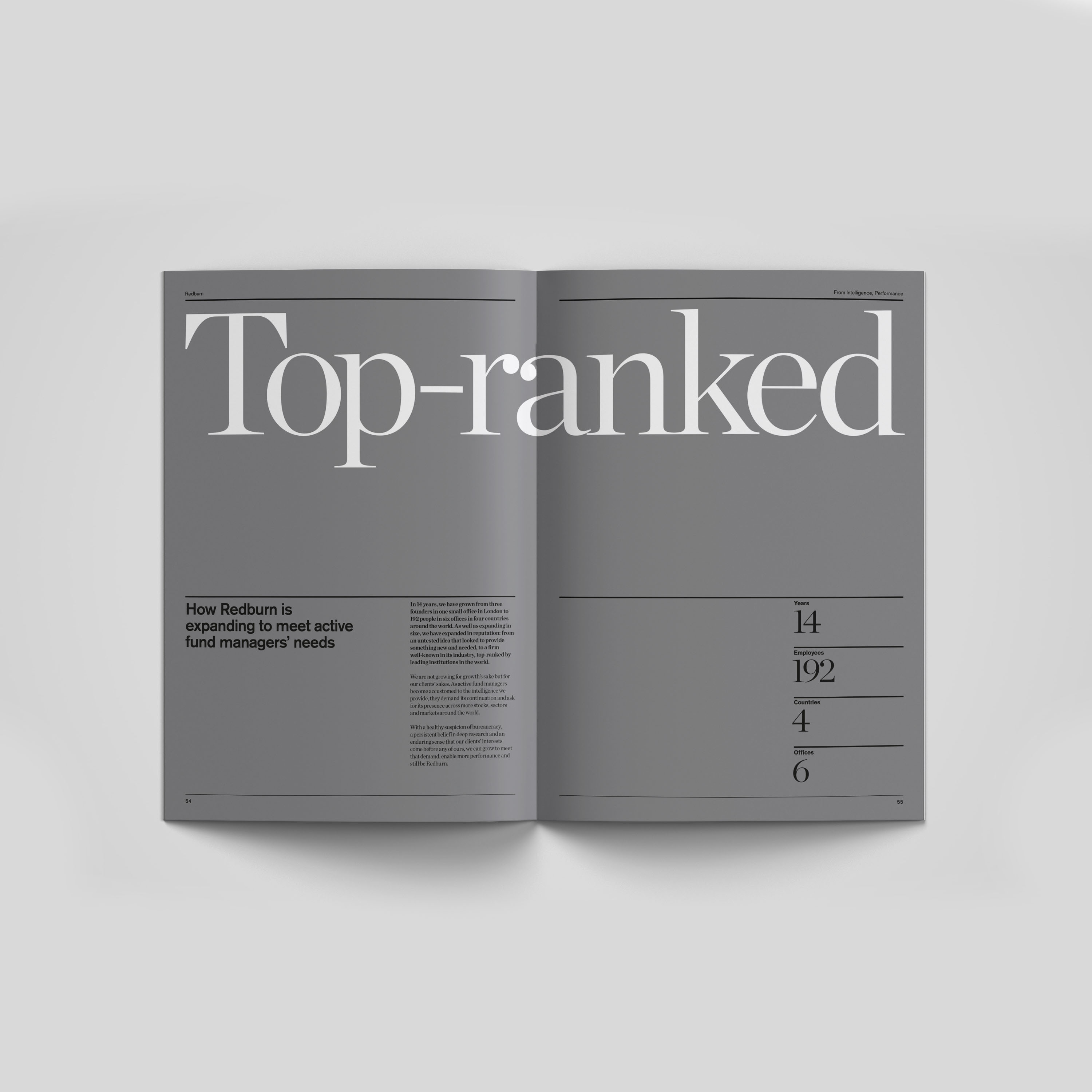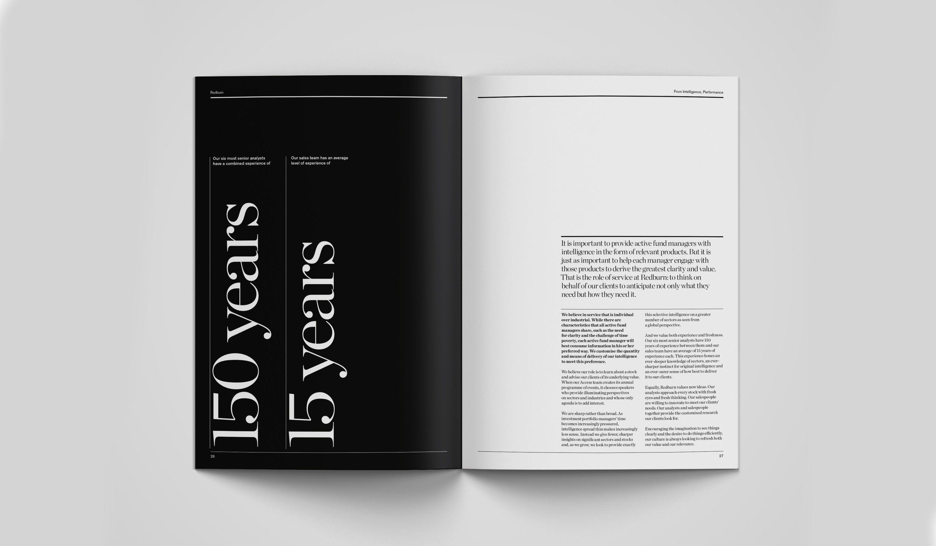 Working with Harry Pearce at Pentagram I designed a book for Redburn. An asset management company that needed a printed publication to show to potential clients. I designed the book that blends photography, quotes, content and biographies in a way that is visually dynamic and uses the typography in a structured but also expressive way while maintaining coherence through a consistent design language rooted in the brand’s identity.