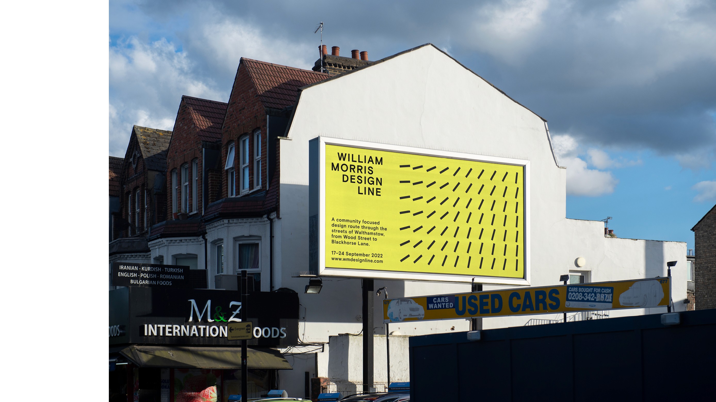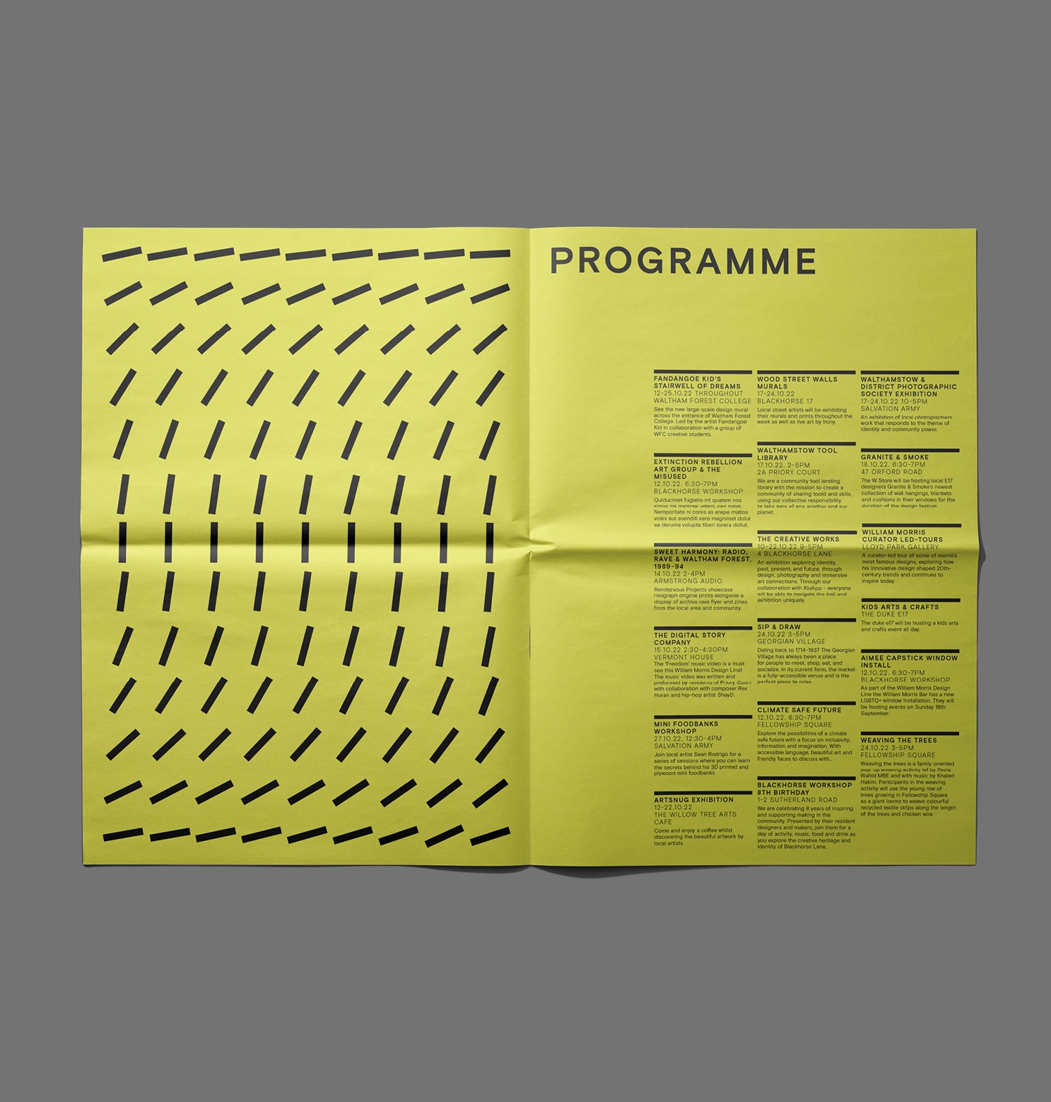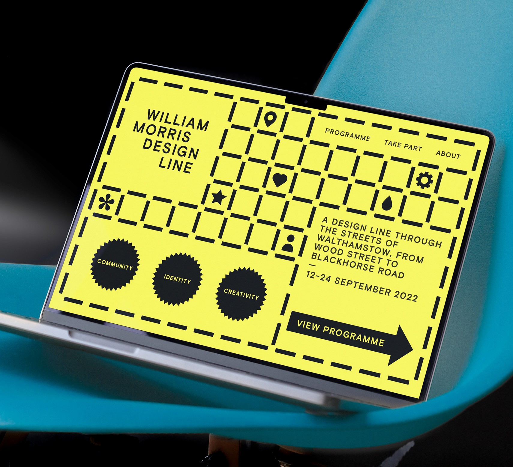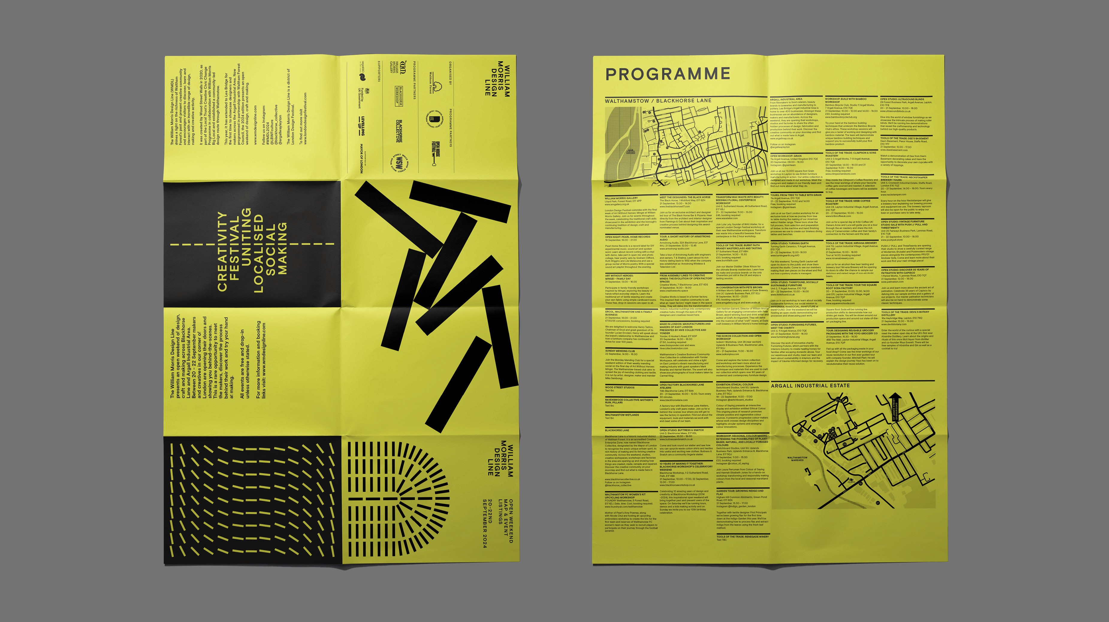 The William Morris Design Line presents an open weekend of design, craft and making across Walthamstow. Over several days makers and creatives in Waltham Forest open their doors and show visitors behind-the-scenes of their work and process whilst giving people a chance to try their hand at making. The identity is born out of the idea of a trail being marked on a map often with a dashed line. Through aligning the letter 'i' present in the wordmark we were able to give a nod to this dashed line. This line can then be extracted from the typography and expanded on to be used as an ownable graphic device to form patterns, iconography and stylized compositions, both functionally and decoratively. The color palette is intentionally simple and attention grabbing. Since much of this will be running as functional signage throughout the design route, it was appropriate to have a single distinguishing color to help navigate people through the design route.